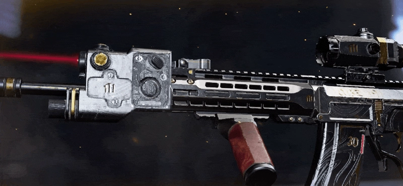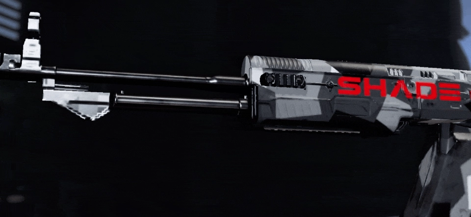 「阴影·AN94」整体以黑灰白作为主基调,其侧方醒目的红色标识 “SHADE” 十分惹眼,再搭配上枪口处的红色涂层。当暗红的枪口于夜幕之中闪烁亮起时,那一抹鲜艳的猩红,就仿佛是死神即将降临的预告。