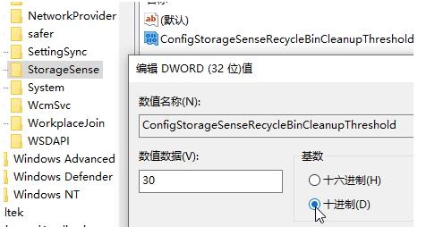 请按以下步骤操作:在StorageSense上点击鼠标右键,选择新建 - DWORD(32 位)值,将新建的值命名为ConfigStorageSenseRecycleBinCleanupThreshold 。之后,再次右键点击该值并选择修改,也可以直接双击它。在弹出的窗口中,把“基数”切换为十进制,接着填入天数,需要注意的是,填入的天数最大不能超过365天。