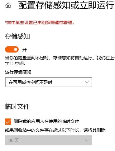 完成此设置后,设置里的存储感知页面会显示“其中某些设置已由组织隐藏或管理”,同时在此处无法更改天数。