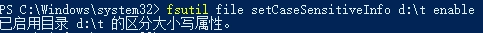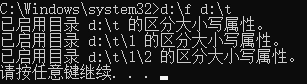 例如使用命令“fsutil file setCaseSensitiveInfo d:\t enable”,要是路径里面存在空格,那就得把整个路径用英文双引号括起来 。