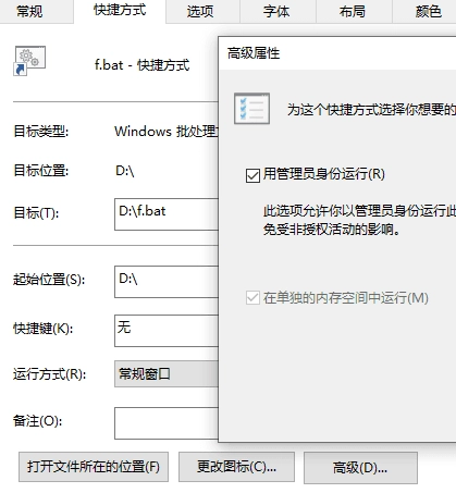 2、为命令文件创建一个快捷方式,右键点击快捷方式,选择属性,点击快捷方式选项卡下的高级按钮,勾选“用管理员身份运行”,确定。