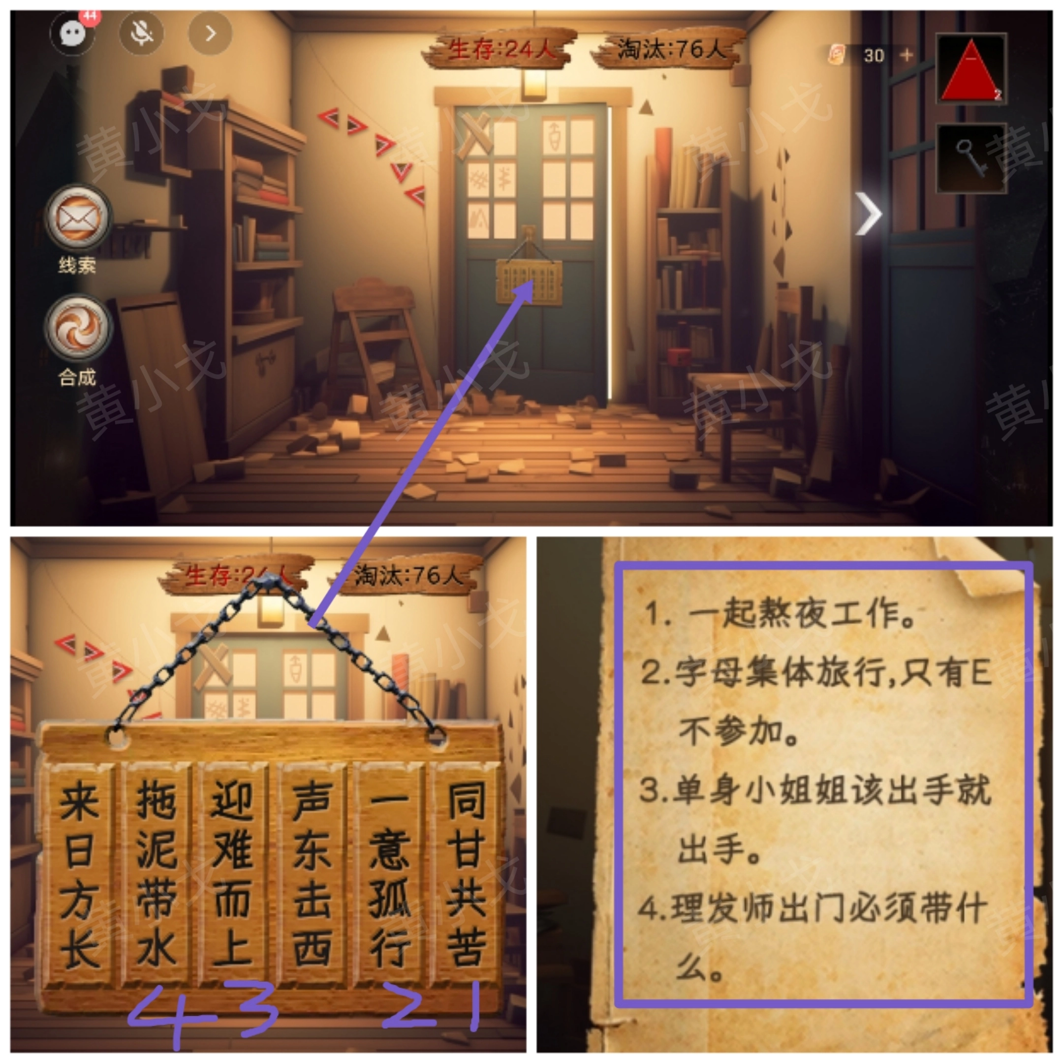 6. 点击门上的牌子,依据男主那里的线索,按照顺序按下木牌。