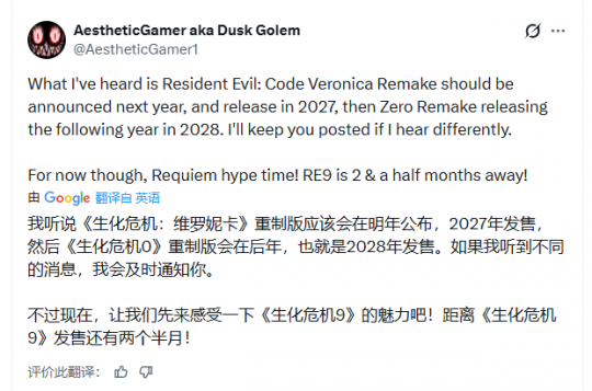 该消息人士透露,此前外界对这款作品的发售时间有2027年和2028年两种猜测,且不清楚它是否会早于《生化危机0》重制版推出。依据他掌握的最新信息,《生化危机0》重制版计划在2028年发布,所以《代号:维罗妮卡》重制版于2027年登场“并非没有可能”。他还特别指出,若后续情况发生变化,会“及时更新相关动态”。
