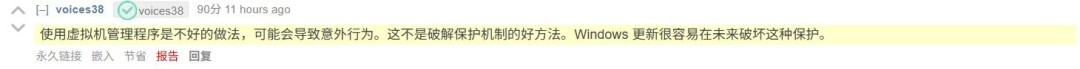 voices38称:“采用虚拟机管理程序并非明智之选,或许会引发系统行为难以预测的问题。这种做法属于拙劣的手段,后续Windows的任何更新都有可能轻易使其失效。”