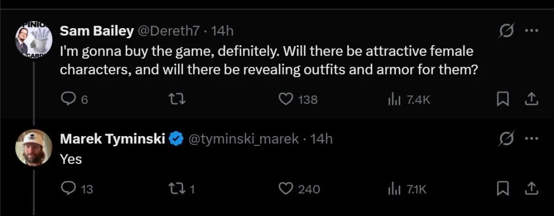有玩家在该文评论区提问:“我打算购买这款游戏,想知道里面是否会有外形靓丽的女性角色?她们的服装和盔甲设计会不会比较暴露呢?”对此,Marek Tyminski给出了肯定的答复:“当然会有”。此外,他也对“游戏的核心应该是趣味性,而非一味追求政治正确”这一观点表示了认同。