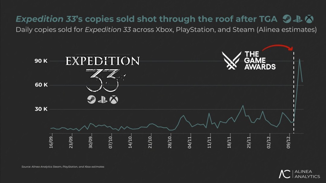 根据市场分析机构Alinea Analytics的报告,自从TGA颁奖典礼结束后,《33号远征队》在全球的销量新增了二十万份以上,日平均销量更是激增了接近六倍。从销售渠道的数据来看,新增销量里大约有76%来自Steam平台,21%来自PS5平台,Xbox平台的占比则只有3%左右。