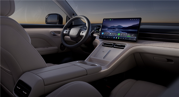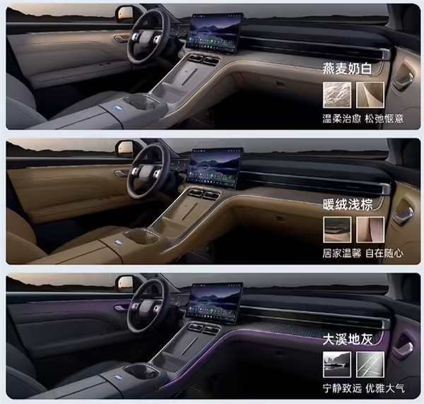 车内部分,新车延续了AION V的极简设计风格,提供燕麦奶白、暖绒浅棕、大溪地灰三种配色选择,同时搭载了方形悬浮式中控屏与仪表盘、双无线手机充电面板以及32色氛围灯。