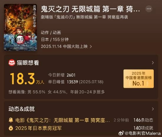 今日,《鬼灭之刃 无限城篇》官方微博发布消息,正式宣布电影《鬼灭之刃:无限城篇 第一章 猗窝座再袭》将于11月14日上映!