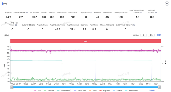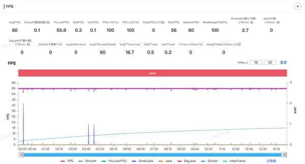《王者荣耀》的画质设置为高清,分辨率为超高,开启抗锯齿,帧率为60帧。实测一局排位的帧率为60帧,稳帧指数为0.1,整体很流畅没有波动。