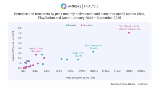 根据Ampere Analysis的统计数据,在2024年1月至2025年9月这将近两年的时间段内,游戏主机(如Xbox、PlayStation)以及PC端Steam平台上推出的游戏重制与复刻类作品: