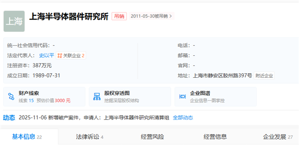 11月10日消息,据全国企业破产重整案件信息网及上海市第三中级人民法院发布的公告显示,上海半导体器件研究所目前已进入破产清算阶段。