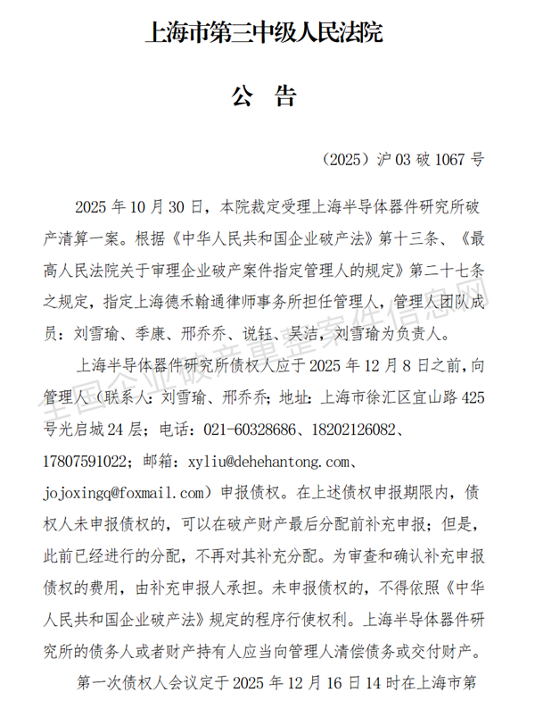 公告内容显示,2025年8月27日,上海市第三中级人民法院依据申请人上海汇盛实业有限公司提出的申请,裁定受理针对上海半导体器件研究所的强制清算案件。