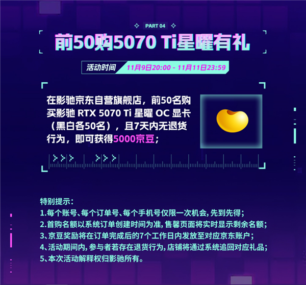 活动内容:前50名购买影驰RTX 5070 Ti星曜OC显卡(黑白两色各50名)且7天内未退货的用户,可获赠5000京豆!名额有限,先到先得。(名额实时更新,可联系客服查询剩余数量)