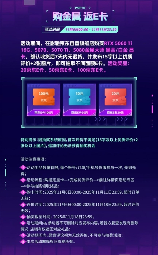 活动详情:凡购买RTX 5060 Ti 16G、5070、5070 Ti、5080型号的金属大师系列显卡,在确认收货7天内未发生退货,且发布15字以上的好评并附上2张图片,就能参与20元、50元或100元京东E卡的抽奖活动!