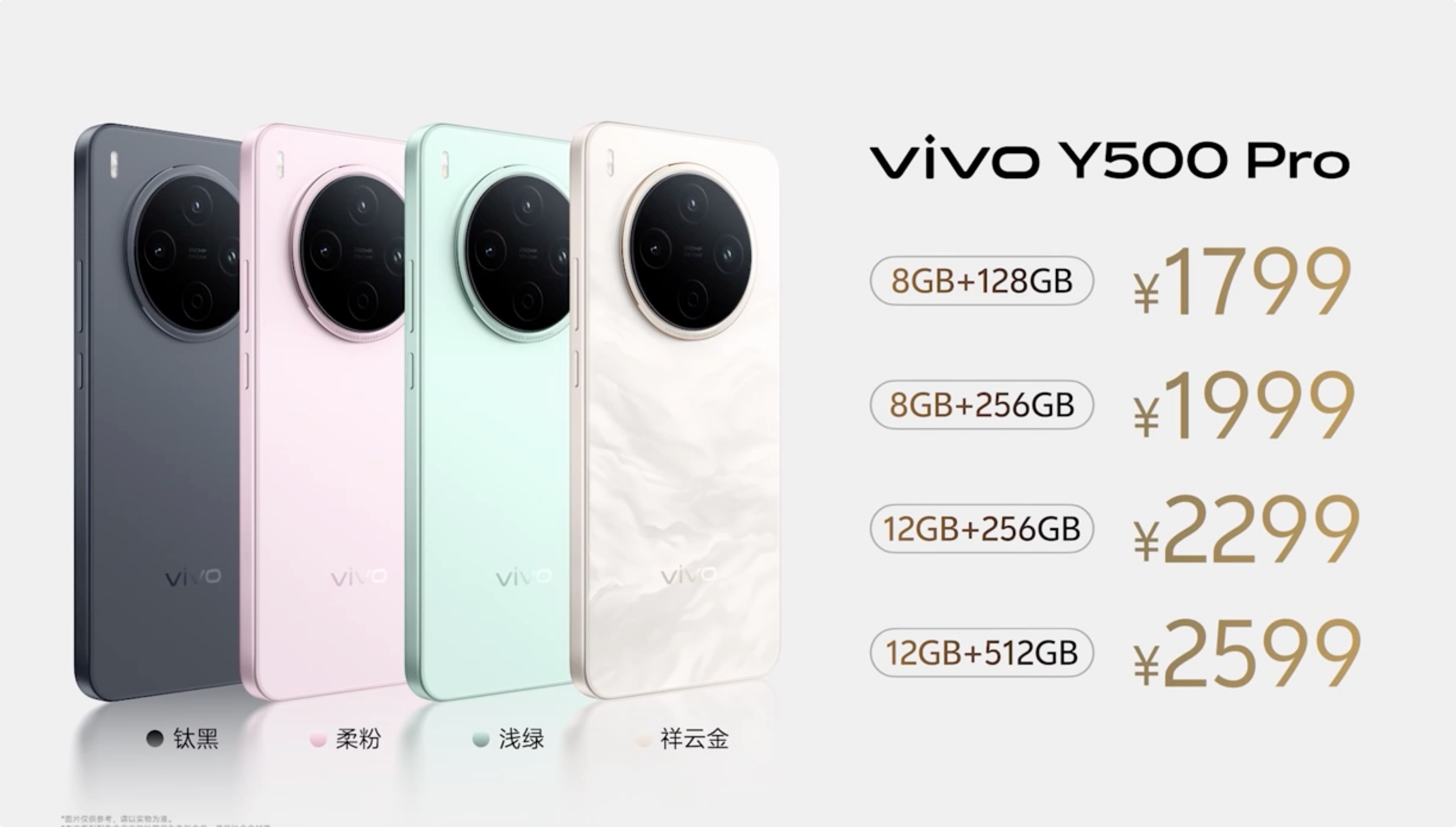 vivo Y500 Pro提供祥云金、浅绿、柔粉、钛黑四种配色选择,不同存储版本定价如下:8GB+128GB版本1799元,8GB+256GB版本1999元,12GB+256GB版本2299元,12GB+512GB版本2599元。该机型现已启动预售,11月14日将正式上市,部分省市消费者还能额外享受15%的国补抵扣优惠。