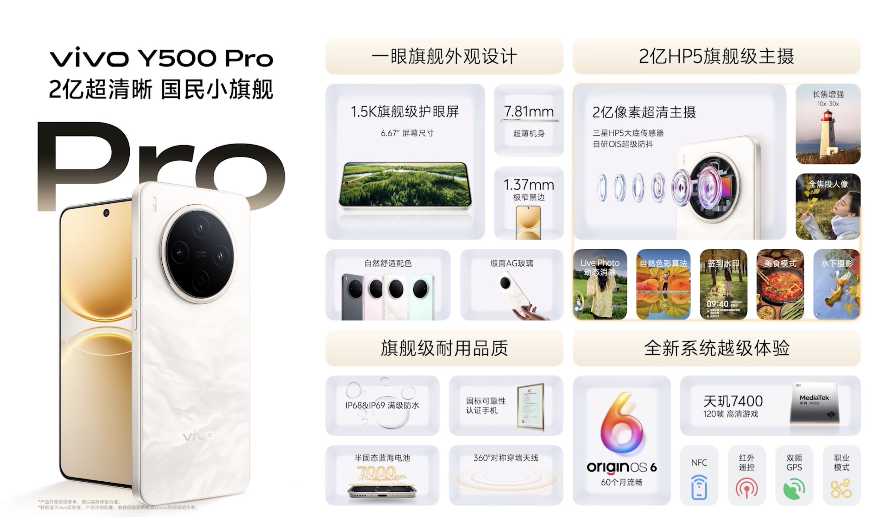 防水耐摔上,vivo Y500 Pro 通过 IP68+IP69 测试,整机拥有 12 层精密防水结构;升级后的磐石抗摔结构,通过国标可靠性认证。