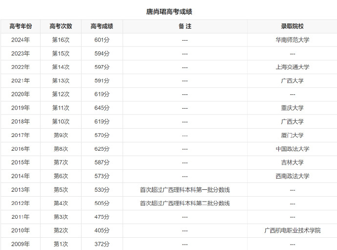 从 2009 年到 2024 年,唐尚珺足足考了 16 次高考,期间考上过中国政法、厦大、上海交大这些顶尖名校,却都因为专业不合或想冲清华而放弃。