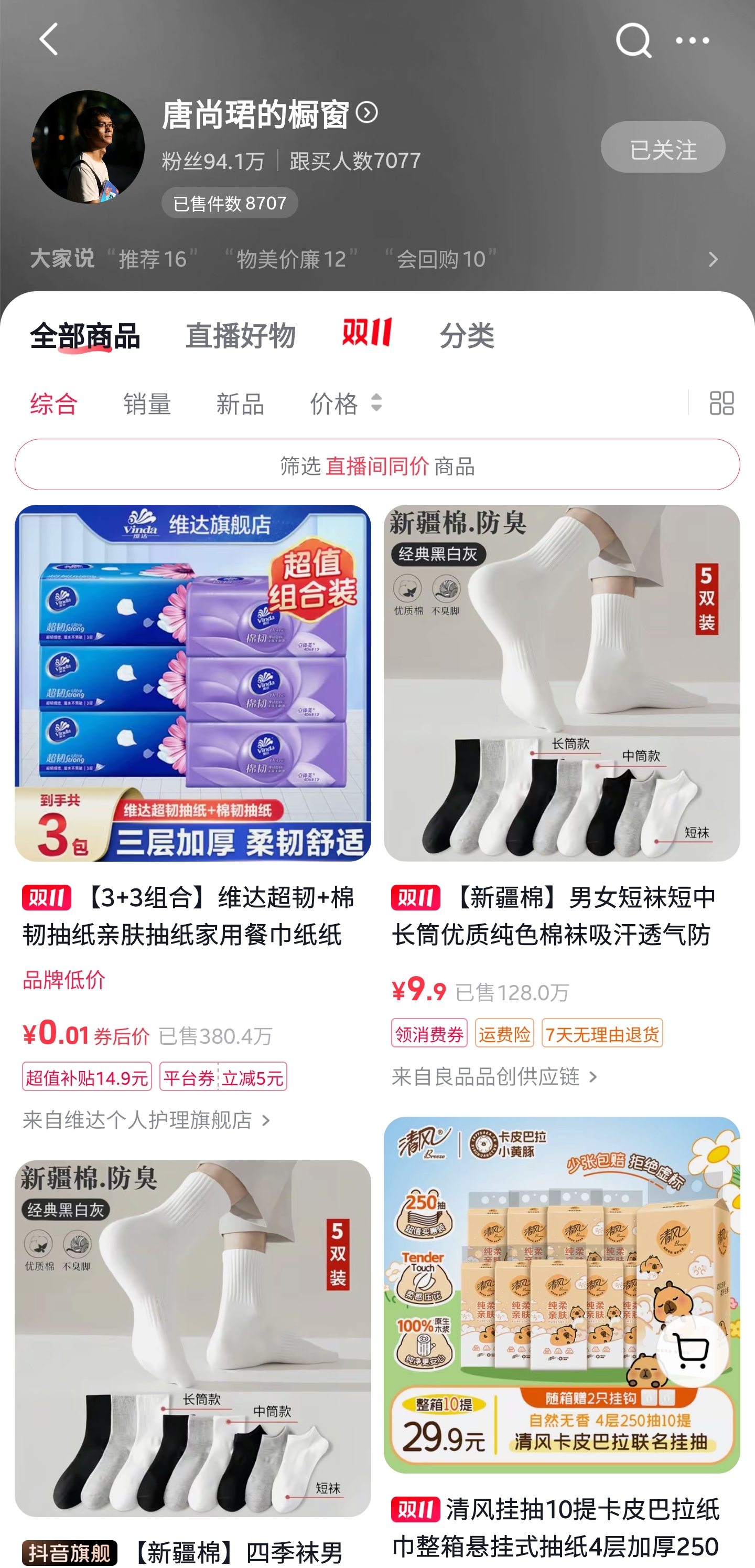 有网友留意到,11月9日那场直播持续了2小时,观看人次竟然达到72万,在线峰值接近8000人,最终售出的商品金额在2.5万至5万元之间,所售商品多为袜子、洗衣液、芒果干这类单价20元以内的小商品。