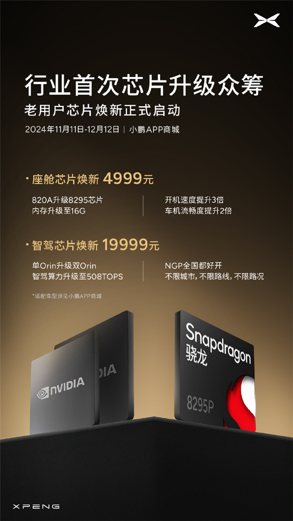 小鹏去年 12 月给老车主开了一个众筹升级芯片的通道,老车主的 820A 芯片直接拉到最新的 8295,体验直接跟上。