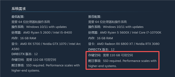 《天外世界2》的硬件配置门槛颇高。根据官方公布的系统需求,该游戏运行需配备16GB内存,且需占用110GB的SSD存储空间。相较于前作仅40GB的空间需求,此次的存储占用量有了明显提升。
