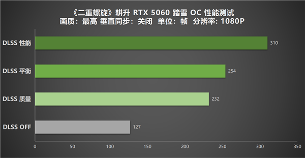 1在1080P分辨率下,耕升GeForce RTX 5060 踏雪 OC的原生性能表现已然超越游戏推荐配置要求,平均帧率稳定在127帧,足以充分满足玩家对游戏流畅度的需求。当开启DLSS 4技术后,其性能迎来了明显的提升:质量模式下,画面质量未受影响,帧率却提升至232帧;平衡模式的帧率达到254帧,是原生性能的2倍,在保证画质良好的前提下,为玩家带来了更为流畅的体验;性能模式的帧率则突破了300帧,平均310帧的画面输出,能够轻松适配240HZ及以上的高刷新率显示器。