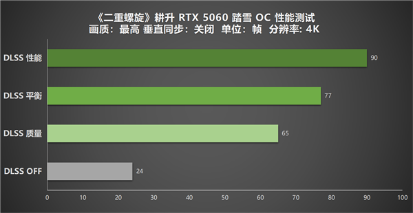 总体而言,在《二重螺旋》中,DLSS 4技术使耕升 GeForce RTX 5060 踏雪 OC在三种分辨率下均能提供远超原生性能的表现,在2K和4K分辨率下效果最为显著,让中端显卡也能享受高分辨率游戏的视觉盛宴。玩家还可选择合适的DLSS 模式,在画质与性能间找到最佳平衡点。