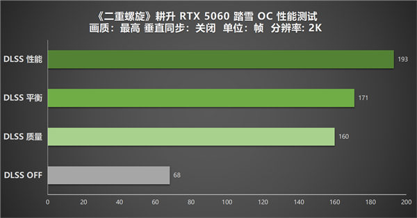 2K分辨率下,耕升 GeForce RTX 5060 踏雪 OC的原生帧数在关闭 DLSS 4 时能维持在68帧,能达到流畅游玩水平。开启DLSS 4后,性能提升更为显著,质量模式的帧率跃升至了160帧,实现了流畅体验;平衡模式的171帧为原生帧数的2.4倍,游戏体验更为丝滑;性能模式的帧率则高达193帧,较质量模式提升约20%,能提供接近电竞级别的帧率表现。