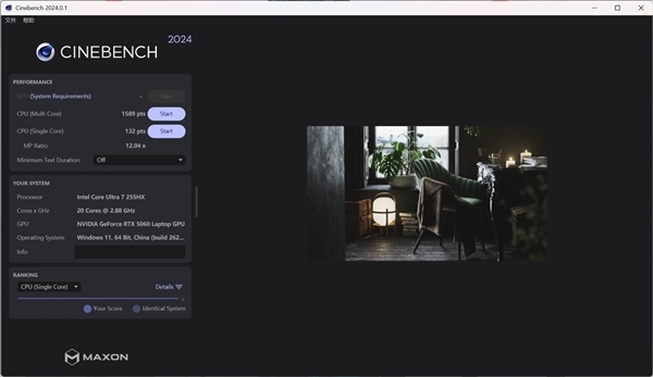 接下来进行的是Cinebench 2024的测试,经实际检测,酷睿Ultra 7 255HX的多核得分达1589pts,单核得分为132pts,这一测试结果和此前的测试情况大致相符,展现出单核性能强劲、多核性能处于中高水准的特点。