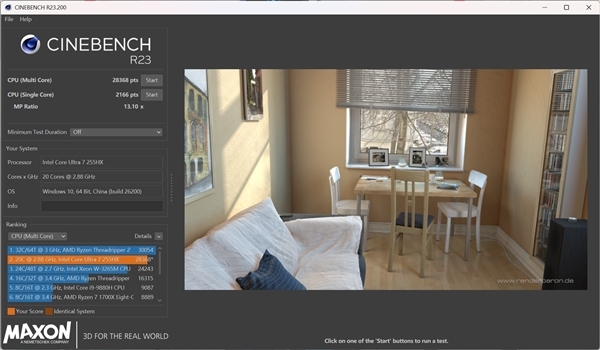 接下来是Cinebench R23的测试环节,实际测试数据显示,酷睿Ultra 7 255HX的多核得分达到28368pts,单核得分则为2166pts,整体性能表现依旧亮眼。其中单核性能的发挥保持了强劲水准,多核性能在当前移动平台中处于中高端梯队,和上一代的i9-14900HX大致处于同一性能区间。