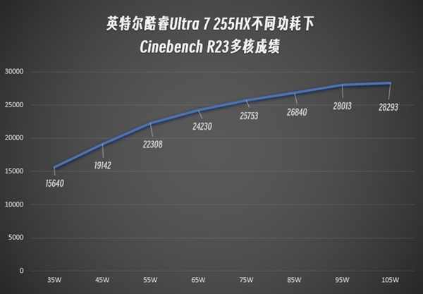 那么它的能效表现如何呢?我以10W为间隔,从35W开始测试,一直测试到105W,使用Cinebench R23多核成绩作为考量,绘制出了不同功耗下的性能曲线。