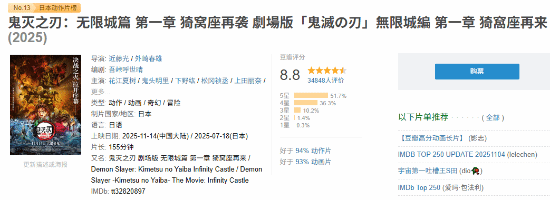 目前,这部影片在豆瓣平台上获得了8.8分的评价,该分数超过了94%的动作片以及93%的动画片,同时在日本动作片的排名中位列第13名。