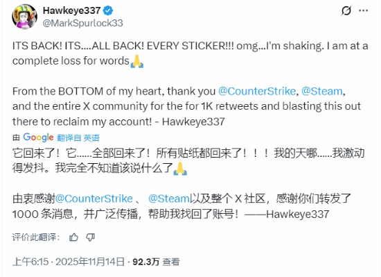 在CS的历史中,贴纸恢复的情况几乎从未出现过。Valve此前仅有一次类似的“奇迹回档”案例,所以很多人都觉得Hawkeye的损失已经无法挽回。然而仅仅数小时后,Valve就对他的账号进行了回档操作,并且将所有贴纸都恢复到了原来的状态。Hawkeye激动地发文表示:“我真的完全说不出话来。发自内心地感谢你们所有人。”