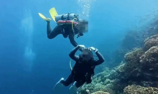 其中,一段时长约44秒的视频显示,一名潜水员正对着镜头比心,身后另一名潜水员伸手操作他的气瓶。紧接着,被操作气瓶的潜水员似乎察觉到了异常,立刻切换到备用二级头。