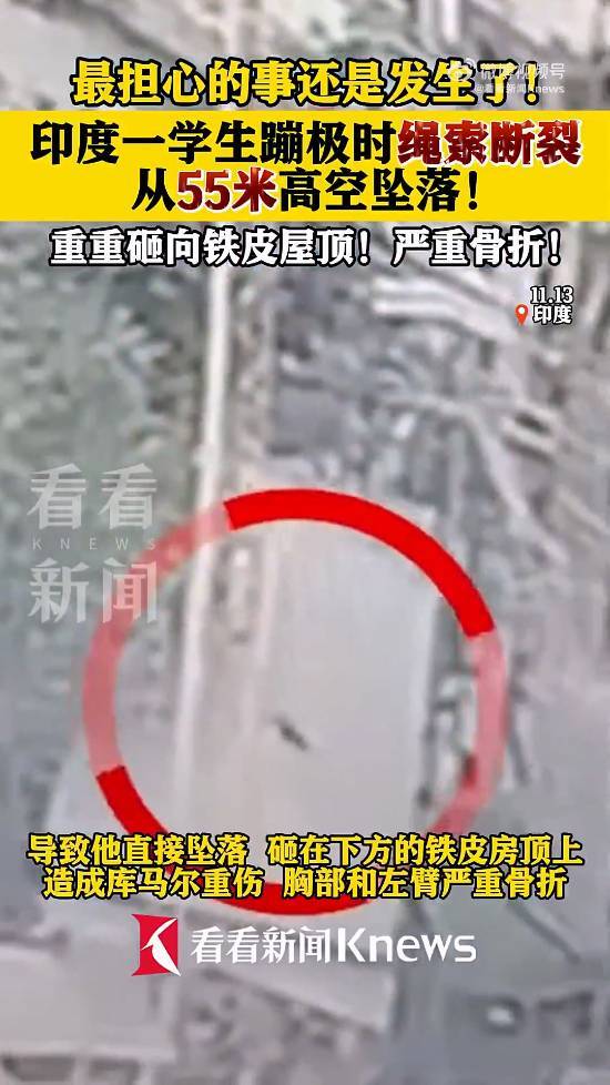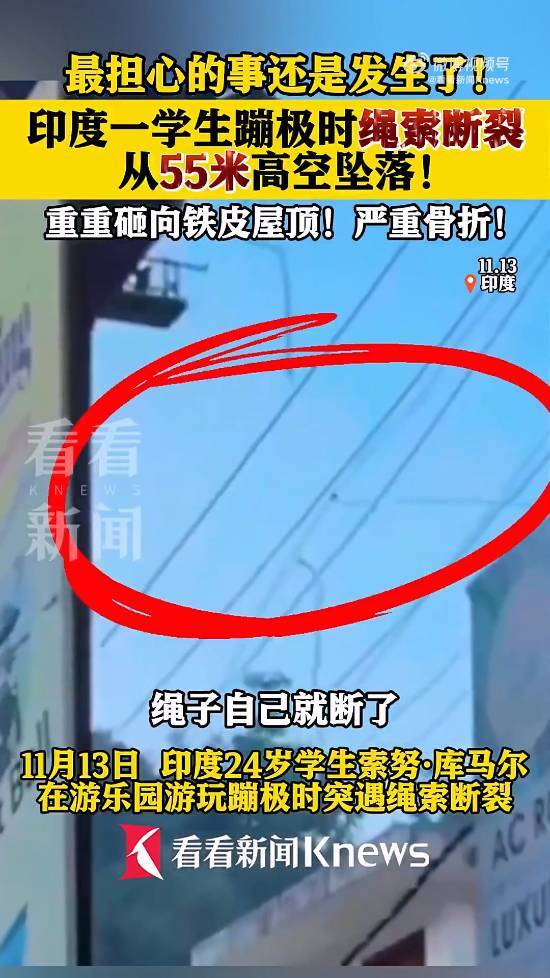 11月13日,印度古尔冈一名24岁的学生索努·库马尔在瑞诗凯诗游乐园体验蹦极项目时,发生了绳索断裂的意外。当时他从55米高的蹦极台跃下后,牵引绳突然断开,致使他径直坠落,撞击到下方的铁皮屋顶。此次事故让库马尔身受重伤,胸部与左臂出现严重骨折,现阶段其病情十分危急。