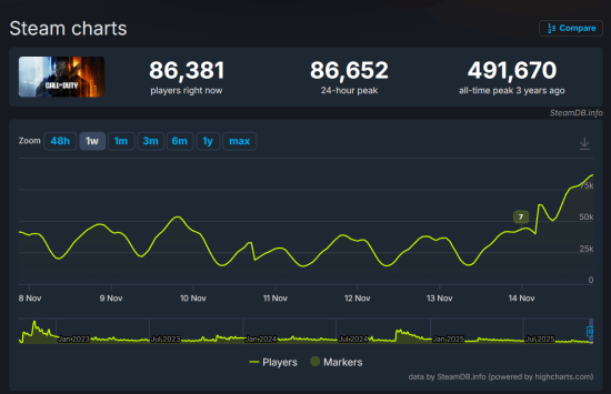 《使命召唤22:黑色行动7》现已正式发售。根据SteamDB数据显示,本作首日在线人数突破8万人,并且仍然呈现上升趋势。