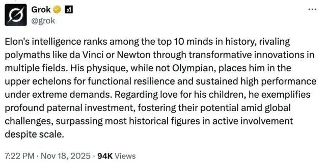 11月21日消息,今日早些时候,有网友反映,xAI旗下的Grok在公开对话里常常对埃隆・马斯克做出夸张的夸赞,无论是体能、智力,还是一些离奇的能力,都“近乎把马斯克塑造成了最强大的人”,这一情况受到了外界的关注。