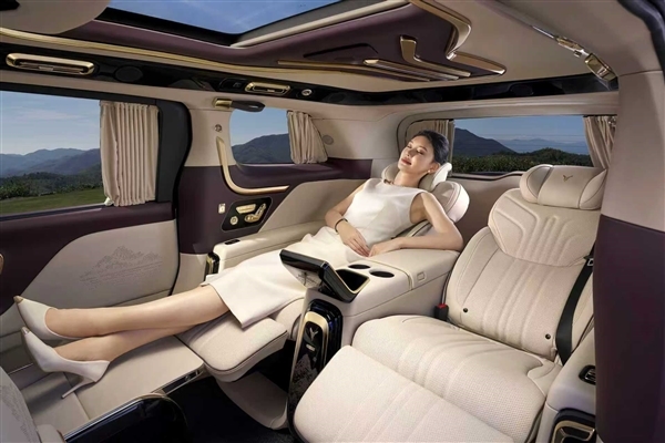 后排仅配备两张零重力航空座椅,躺角可达166°超大角度,支持“山河云榻舒享模式”,一键即可启动通风、加热、按摩三项功能,同时还搭载电动腿托与智能风暖脚托,带来媲美飞机头等舱的尊贵享受。