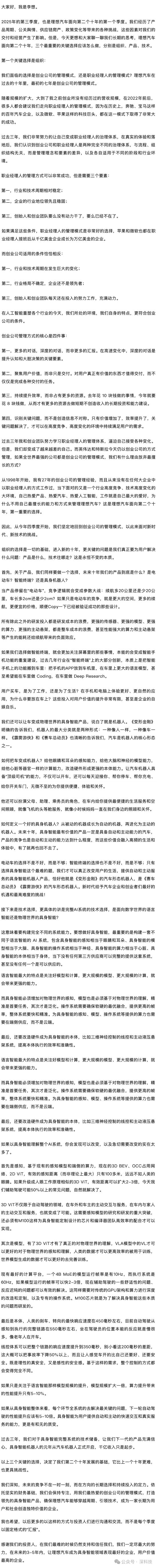李想坦言,过去三年所推行的职业经理人管理体系,与当下新能源汽车行业的发展环境并不契合。当前该行业正处于技术迭代速度加快、市场格局尚未稳定的关键阶段,而创始团队依旧保持着高强度的投入热情与动力,相比之下,更适合采用创业公司的运营模式。