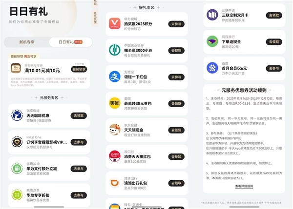 随着新品发布,华为负一屏针对鸿蒙5.1及以上设备同步上线鸿蒙有礼特别版活动:从现在起至12月12日,每周三、四、五可领取一张满10.01元立减10元的元服务优惠券,每周五支持核销。用户既能在中免日上元服务购买小样,也能在美团外卖、瑞幸咖啡、奈雪的茶、猫眼电影、同程旅行等涵盖吃喝玩乐的多元服务场景使用这张10元减免券。不管是午餐点外卖加餐、周五和同事共享甜甜的下午茶,还是周末约好友看《疯狂动物城2》,都可以通过桌面右滑进入负一屏,提前抢券后周五下单,省心又省钱。