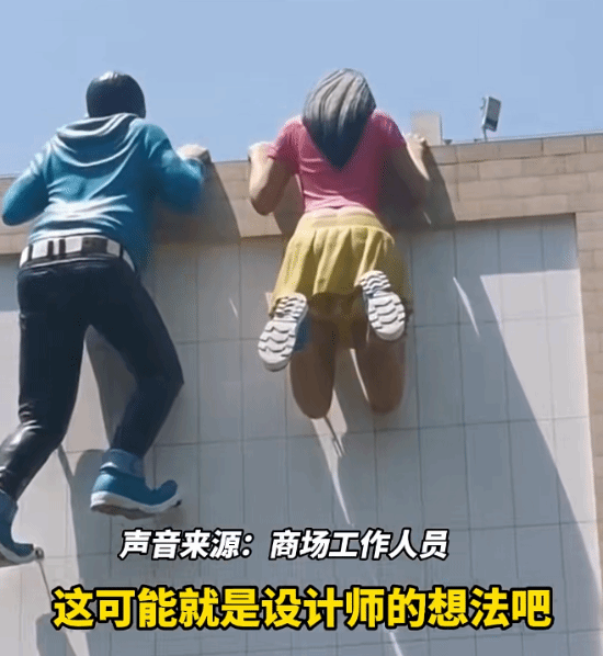 这段文字描述的位置是常州九洲新世界广场幸福蓝海国际影城IMAX的外墙。那里有一座雕像,展现的是一对身形巨大的青年男女以攀爬的姿态附着在建筑外墙上,从外面看过去,呈现的是这两个人物的背影。