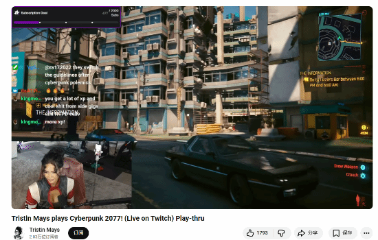 近日,特里斯汀·梅斯在Twitch平台上以帕南的cos造型直播游玩《赛博朋克2077》,她高度还原游戏角色的扮相宛如从游戏中走出的“真人版”,不仅吸引了众多游戏粉丝的目光,也让原本关注她影视作品的粉丝注意到了这款游戏。