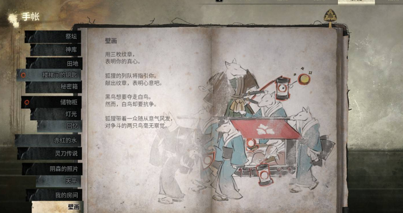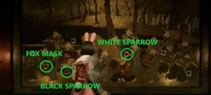 将黑雀纹章放置在狐面纹章右侧的空位上,对应的图案是红箱子下方的灯笼。