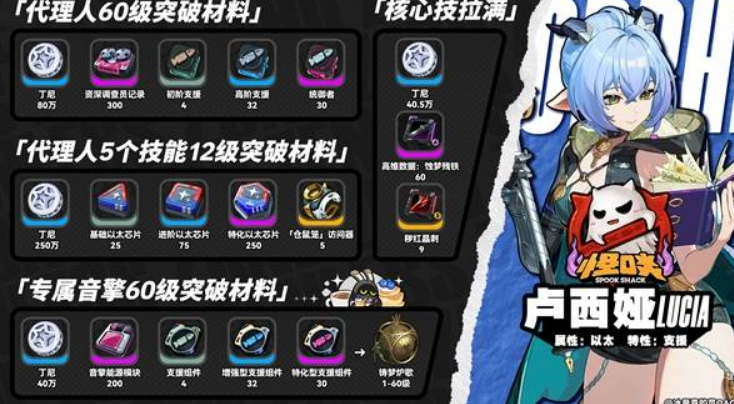 为了方便大家查看,我整理了卢西娅及专属音擎的突破材料图,图中包含卢西娅60级所需材料、5个技能拉满至12级的材料、核心技拉满的材料,以及专属音擎「铸梦炉歌」60级的材料。