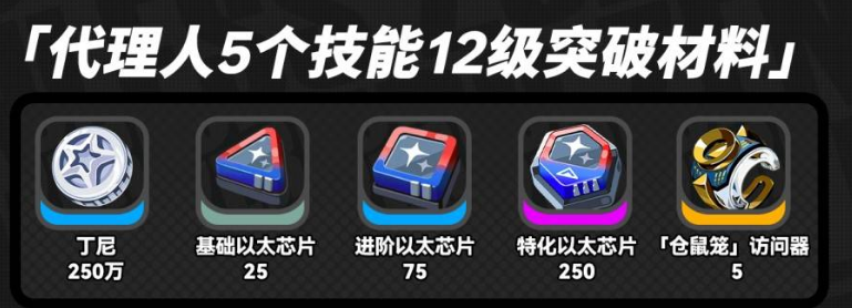 代理人单技能从1级突破到7级所需的材料为:丁尼5万、基础以太芯片5个、进阶以太芯片15个