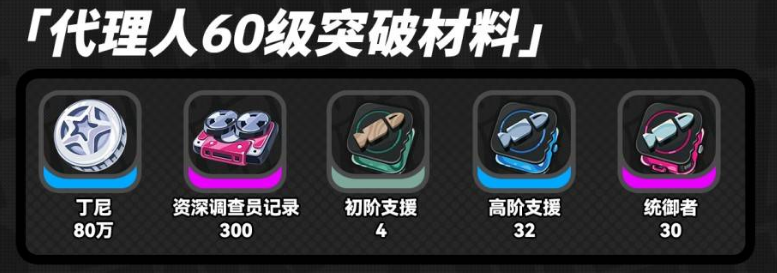 代理人1-40级突破所需材料如下:丁尼20万份、资深调查员记录75份、初阶支援4份、高阶支援32份。