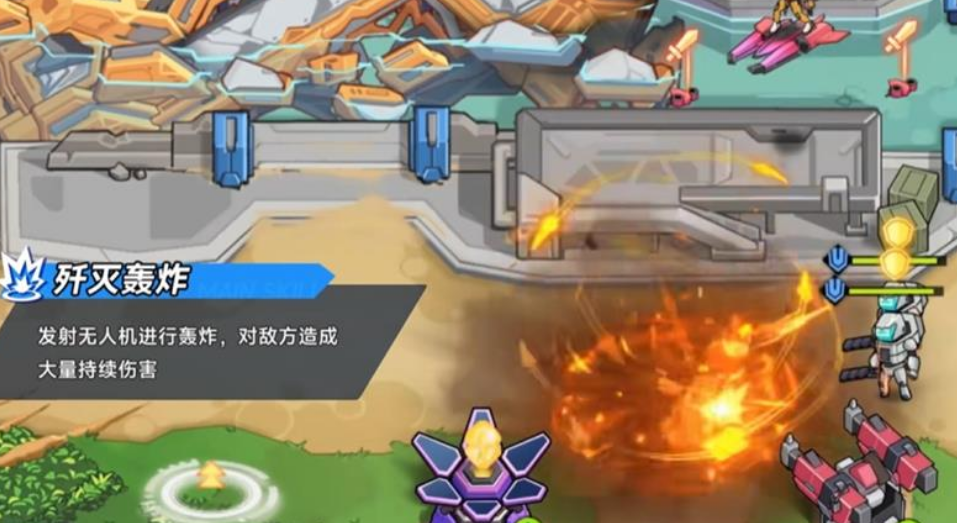 伊莉丝的核心技能之一是歼灭轰炸,此技能可召唤无人机对指定区域实施空中打击。这一机制使她在应对飞行敌人时拥有天然优势。当敌方单位从空中靠近防御塔时,伊莉丝能快速锁定位置并发起轰炸,产生高额范围伤害。该技能释放顺畅,冷却时间适中,在防守战斗中能够有效阻挡空中攻势,降低防御塔的血量消耗,是源序空间里少见的对空特化输出方式。