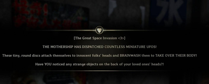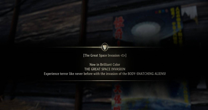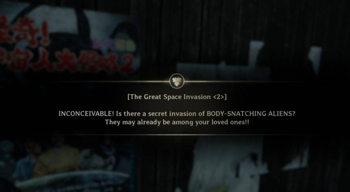 在首次前往戎之丘时能找到UFO广播,第三次前往戎之丘可获取3张电影海报及影评。达成该结局后,在已解锁此结局的存档里,与首张《外星人大侵略!》电影海报进行互动,就能得到新武器PP-8001。