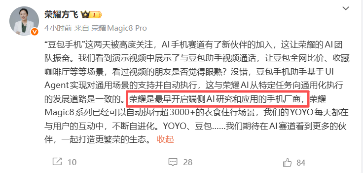 12月4日,荣耀产品线总裁方飞称,看到豆包手机进入市场,荣耀AI团队感到格外兴奋。AI手机领域的竞争日益激烈,更多厂商的加入将推动生态朝着更具活力、更繁荣的方向发展,最终获益的无疑是广大消费者。