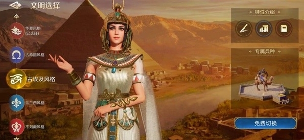 古埃及文明的特性是战斗结束后部队能立刻恢复3%的损失兵力,不过这个恢复比例是基于已损失兵力计算的,3%的数值偏低,实际应用里只有在连续作战时才能体现出一定价值,算是需要挖掘新玩法的文明特性。它的第二个优势专属科技是提升首府和地图上军事建筑10%的耐久度,对实战有帮助但作用不算大——当建筑开始掉耐久时,被拆毁基本是早晚的事,10%的耐久加成没法为反制争取到太多时间。古埃及的专属兵种有两个:沙漠骑兵,在铁器时代解锁,属于智力输出型骑兵;反装甲步兵,是工业时代的物理输出步兵。这两个兵种一个侧重智力伤害、一个侧重物理伤害,输出能力都比较出色。值得注意的是,如果所在联盟拥有“锥形塔”奇观,古埃及文明的强度会有明显提升,搭配“锥形塔”解锁的“斯芬克斯像”,能显著增加自身的资源产量。5、不列颠文明