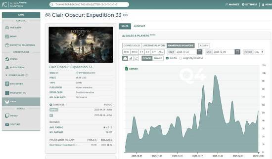 数据分析机构alineaanalytics对TGA年度提名游戏的销量变动情况展开了追踪。从11月17日提名名单揭晓起,依据销量估算数据,在Steam、Xbox(XGP不包含在内)以及PlayStation平台的总销量维度上,《光与影:33号远征队》获得了最多的市场关注度。